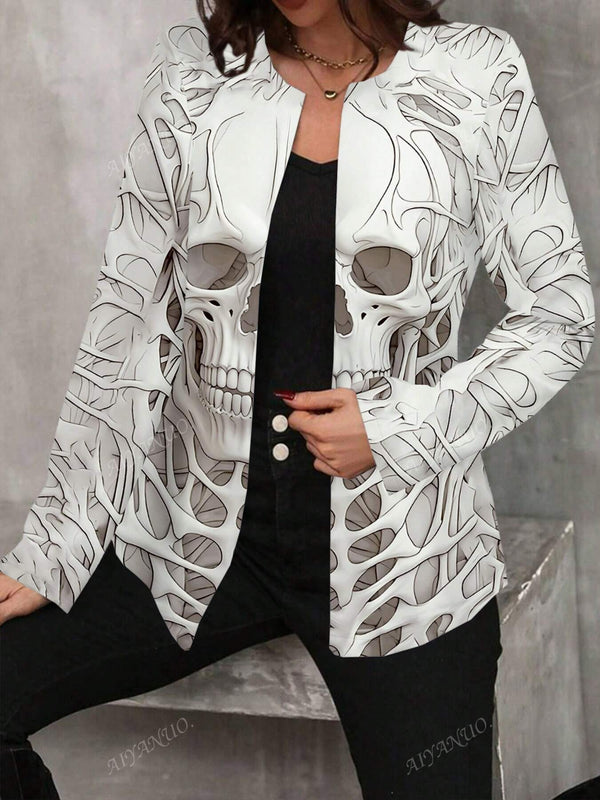 Plus Size Women Knitted Long Sleeve Cardigan With Prominent Skull Print And Queen Anne Collar